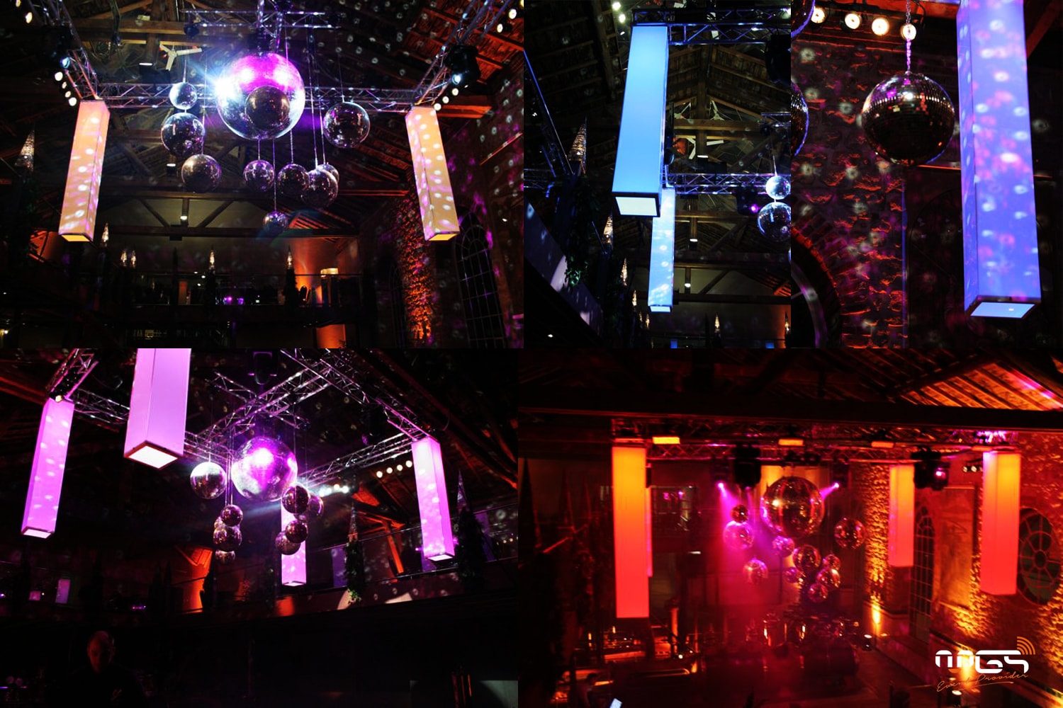 For Avenue Internationale, we provided lighting and sound for Lidl’s disco-flavored event. By combining our wire curtains with our faceted baubles, we’ve created a unique dance floor. We’ve also installed our illuminated round bar.