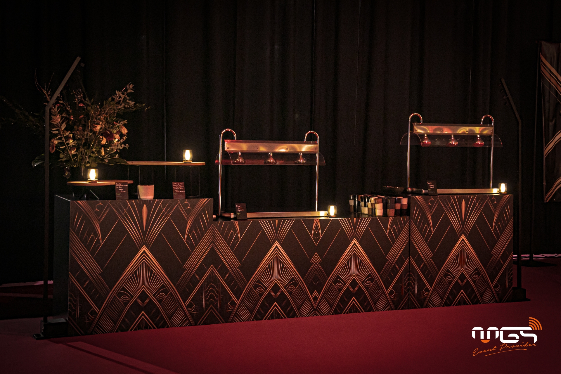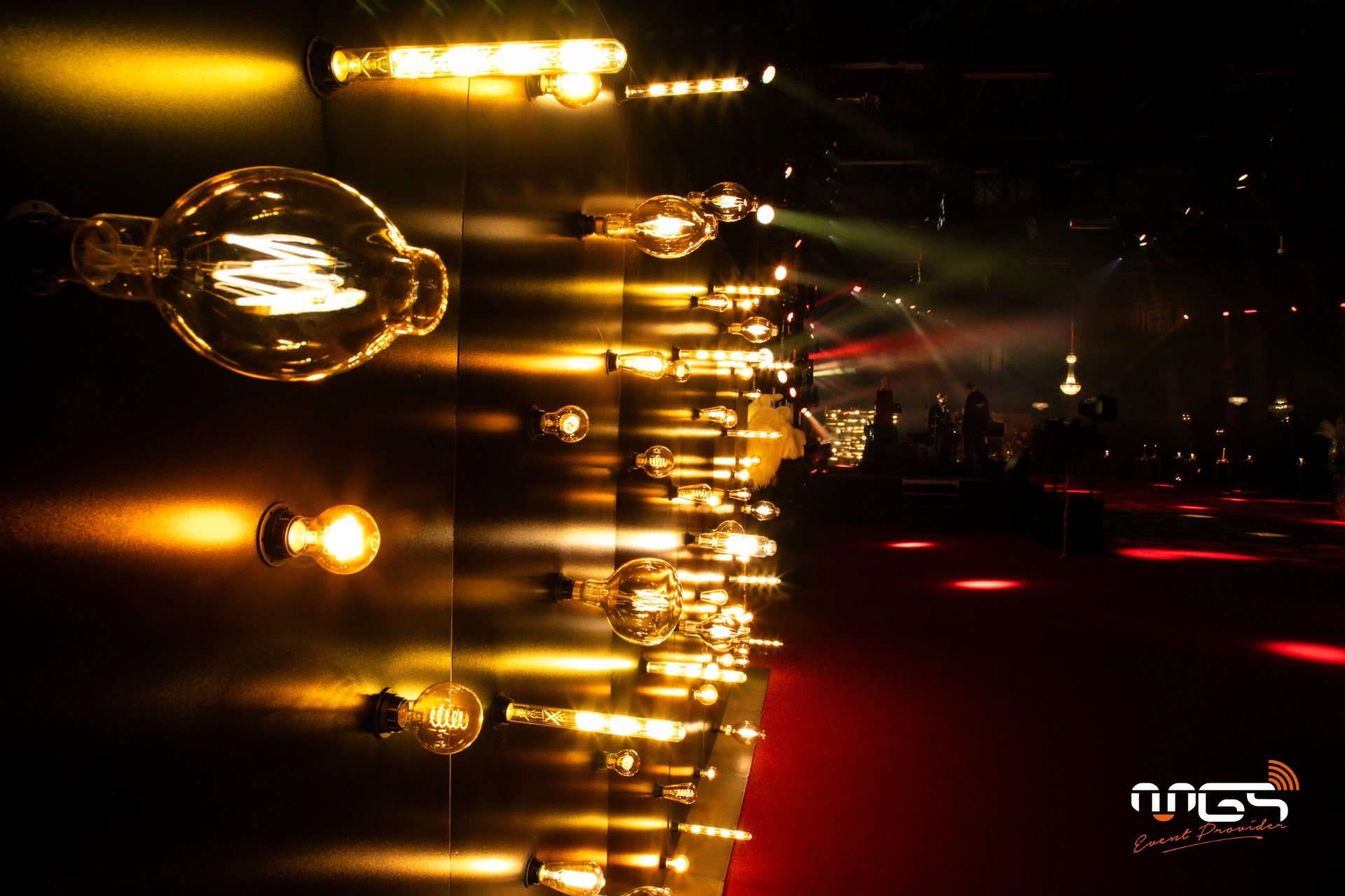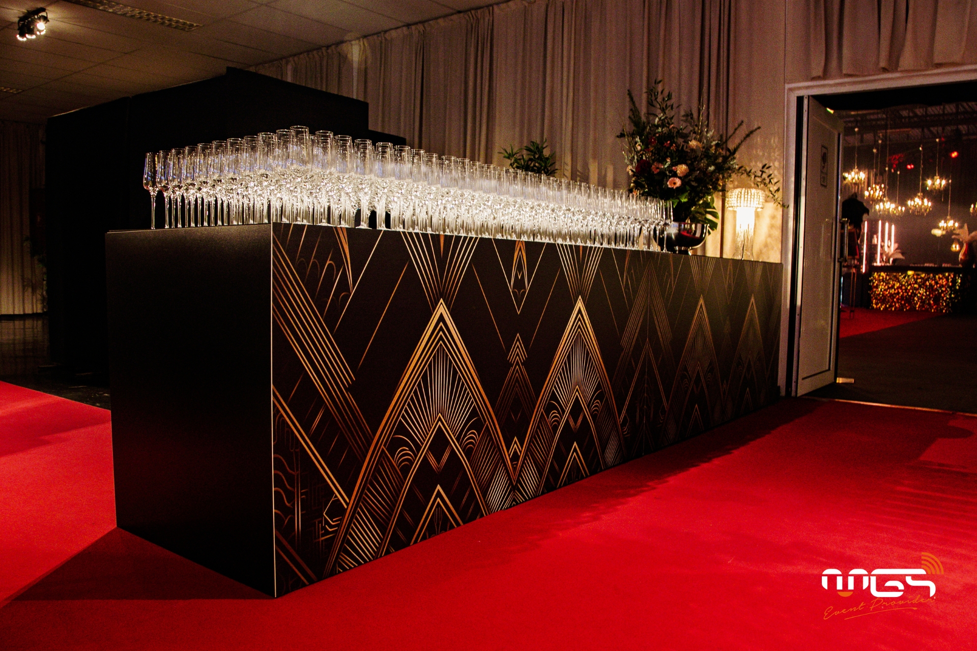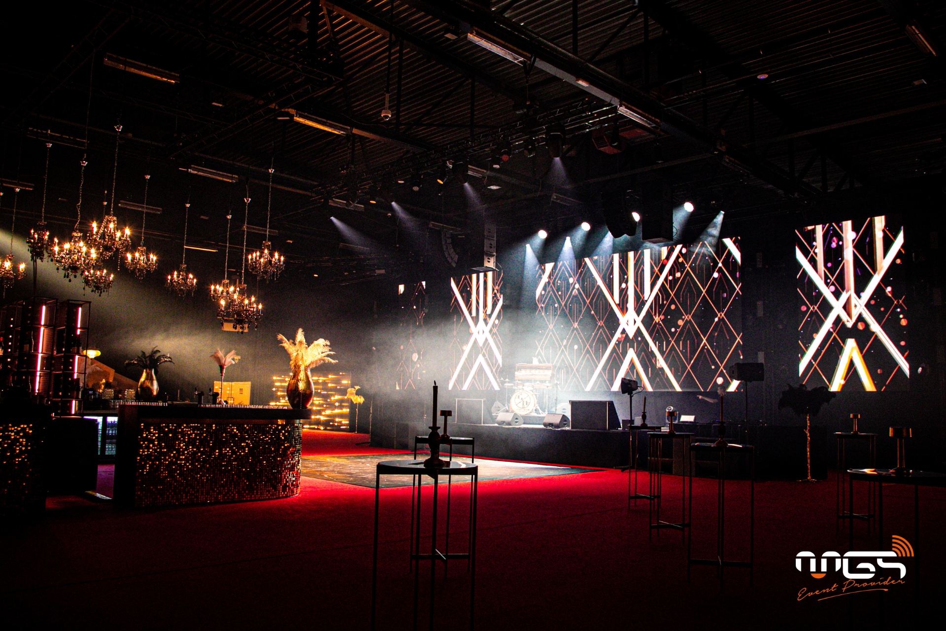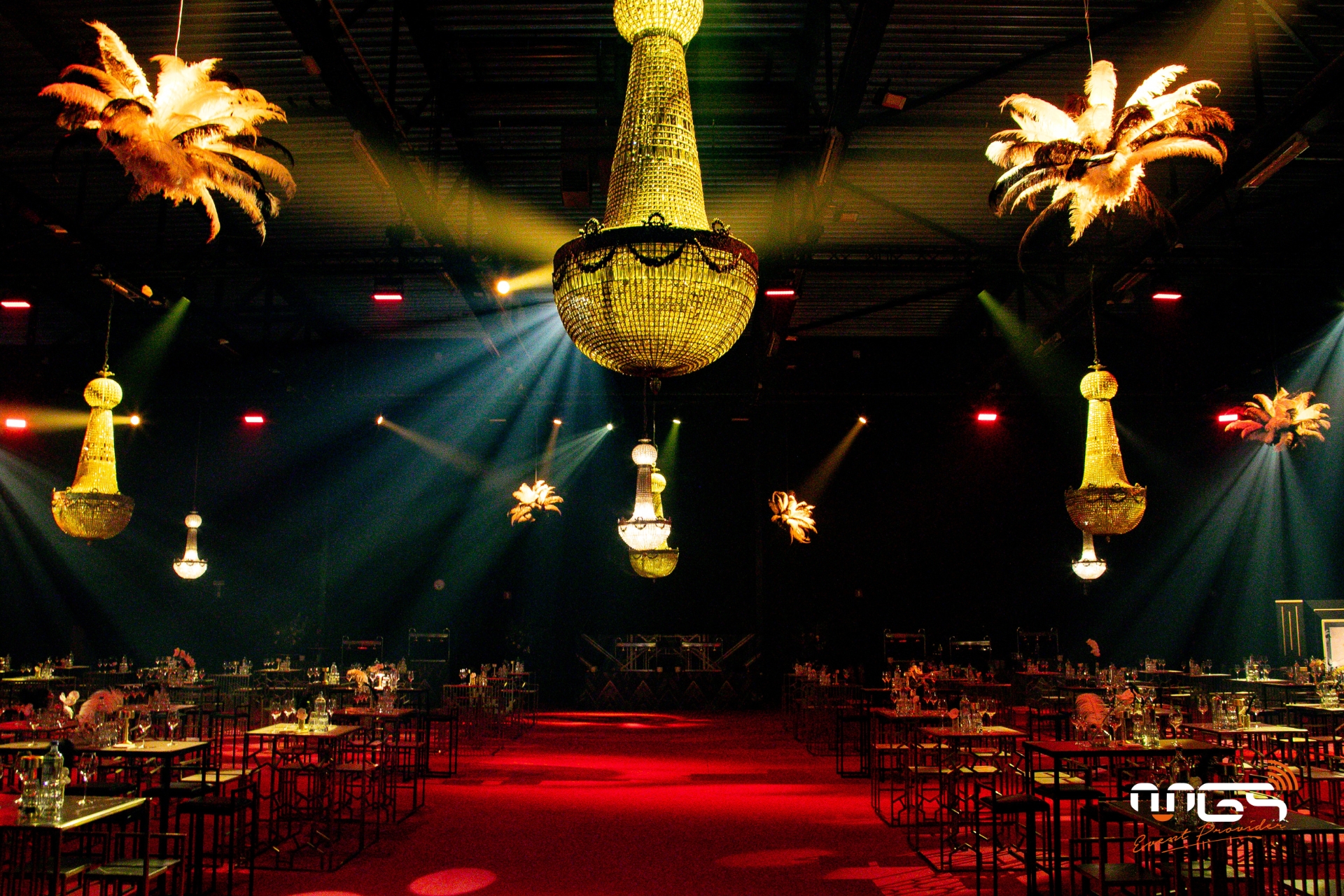 MGS a pu mettre à disposition son matériel et transformer Ciney Expo en deux espaces distincts : d’un côté, une ambiance festive dédiée à la soirée, et de l’autre, un espace consacré au repas. Notre équipe a pris en charge l’ambiance sonore, l’éclairage, la vidéo avec un écran LED de 50 m², deux animations photo, ainsi qu’une partie du mobilier et de la décoration, inspirées de l’univers de Gatsby et des années 1920.