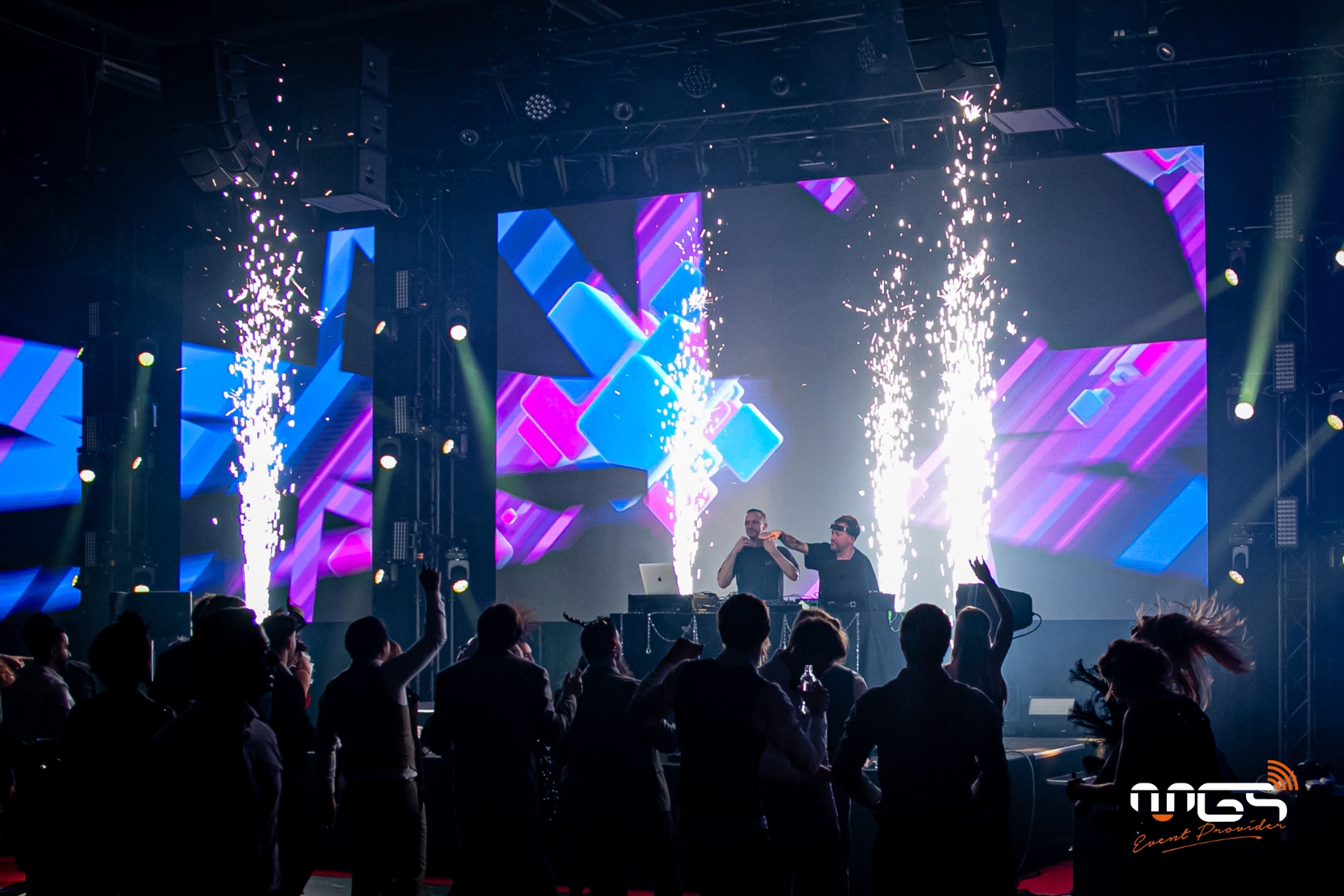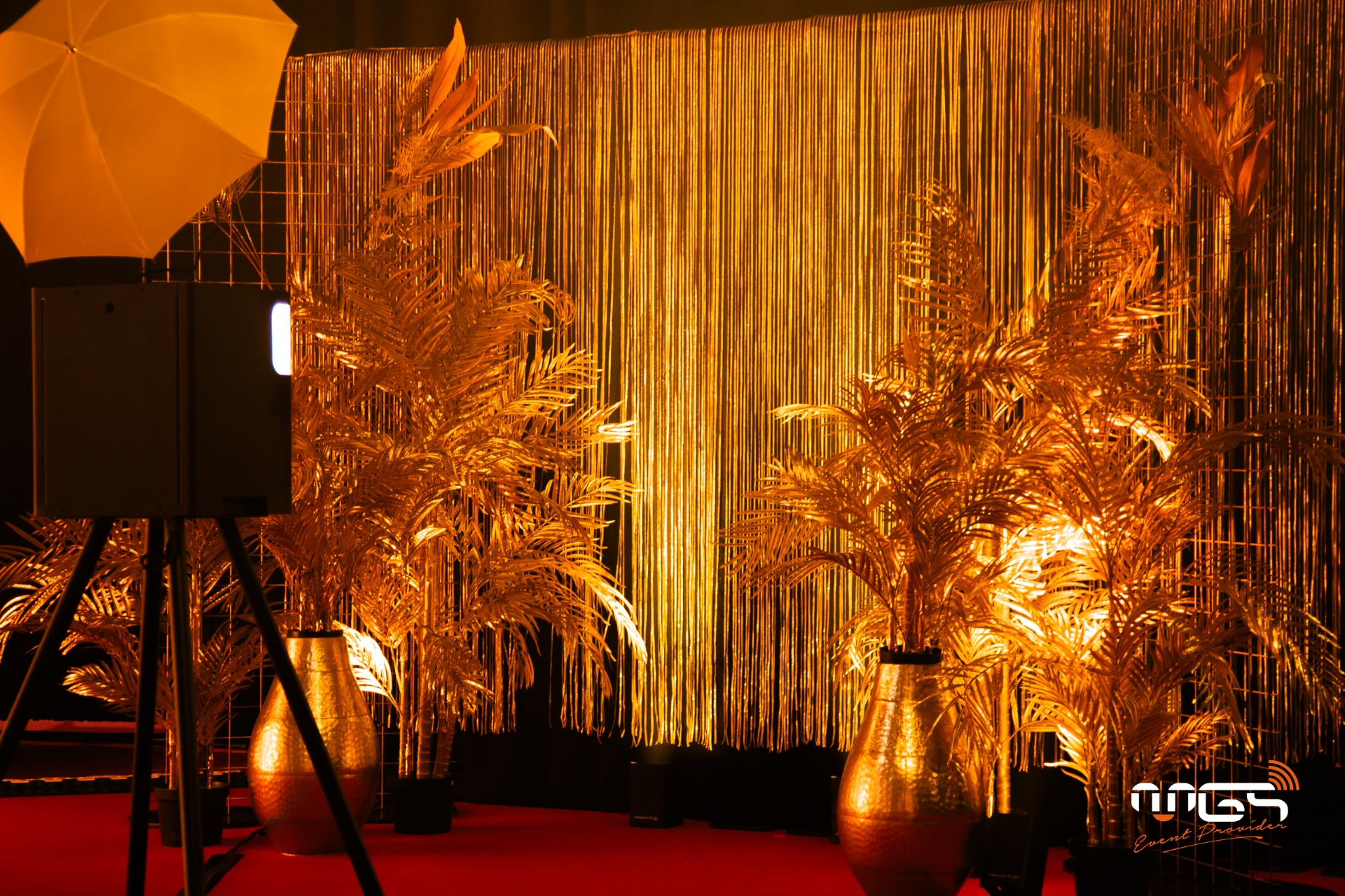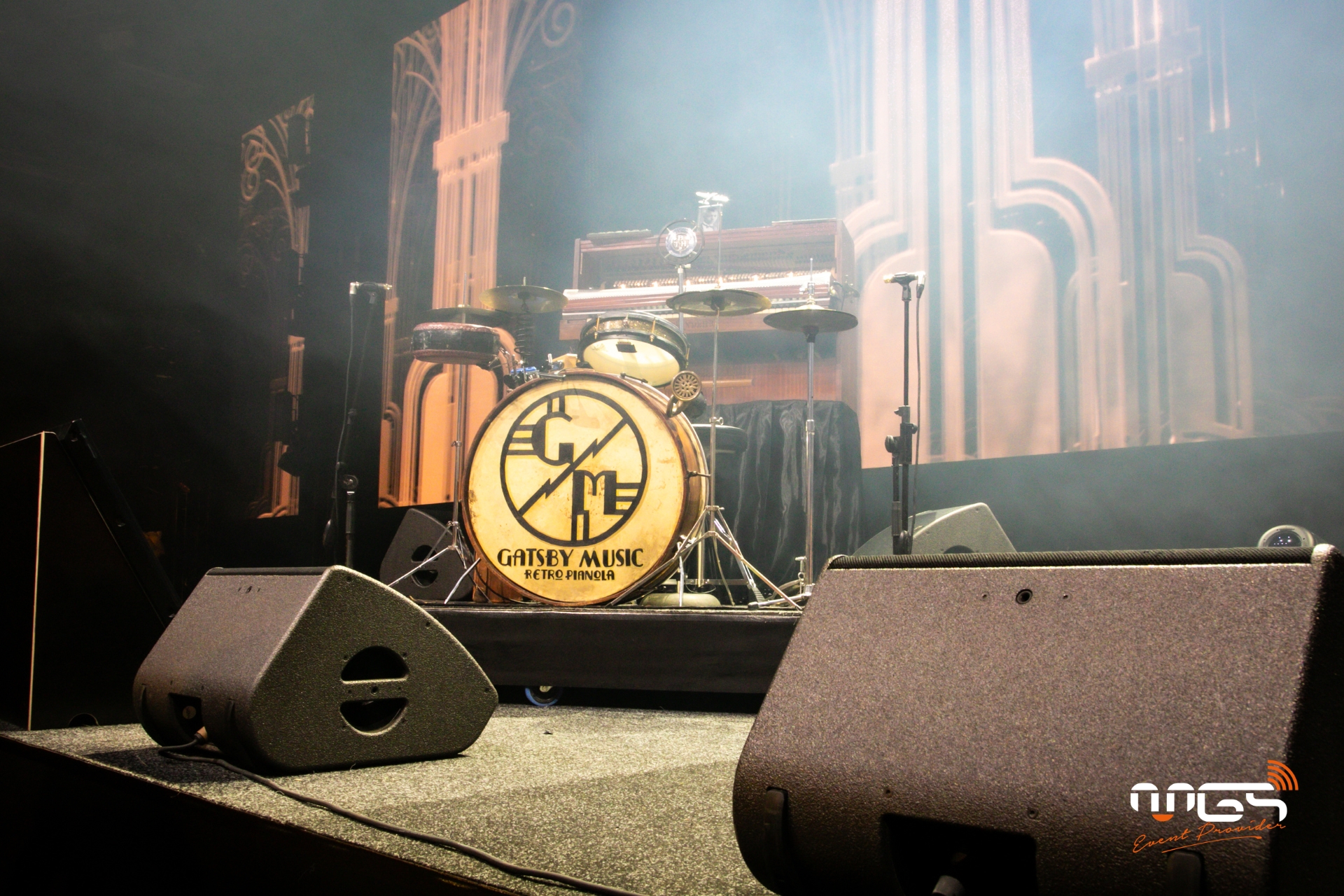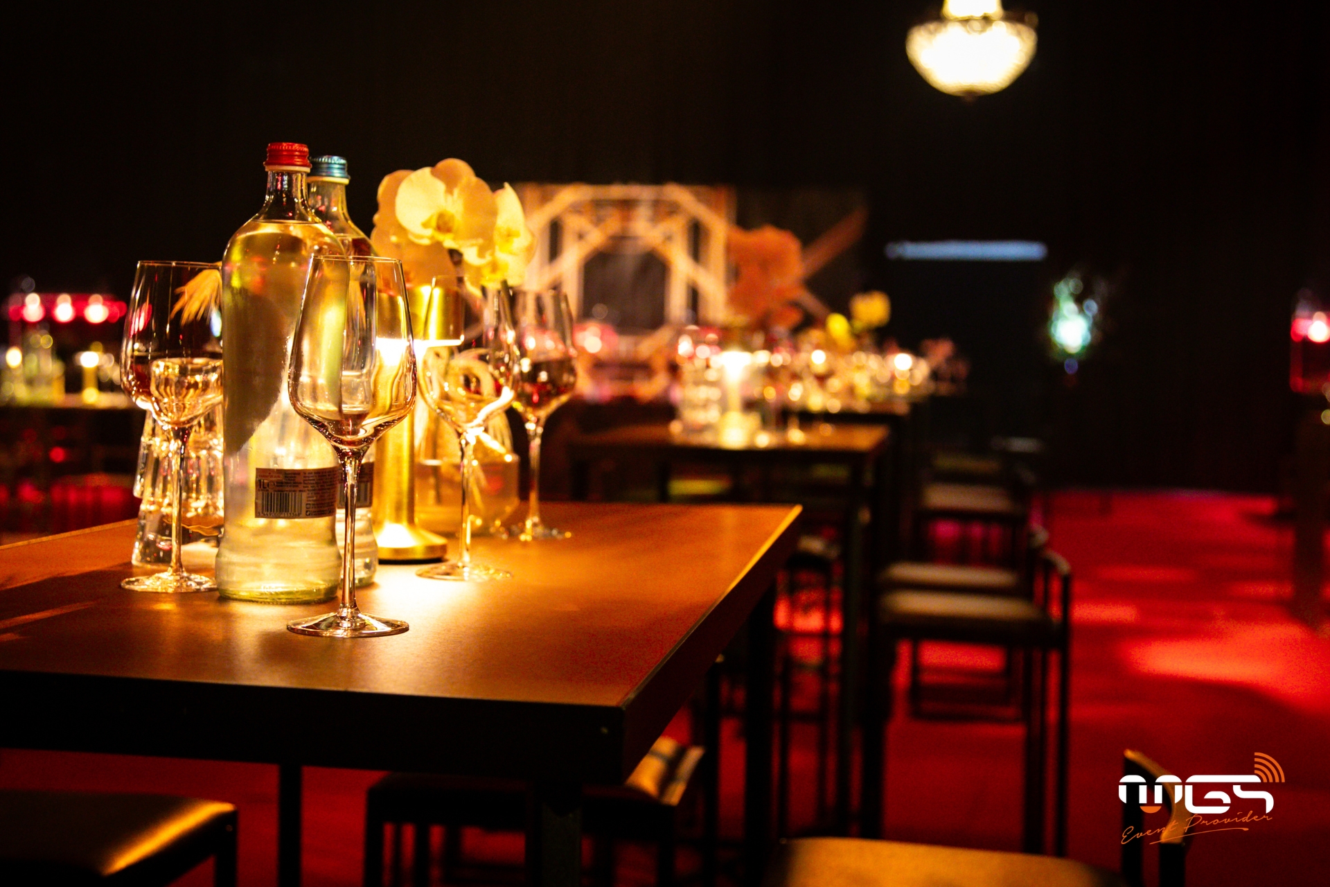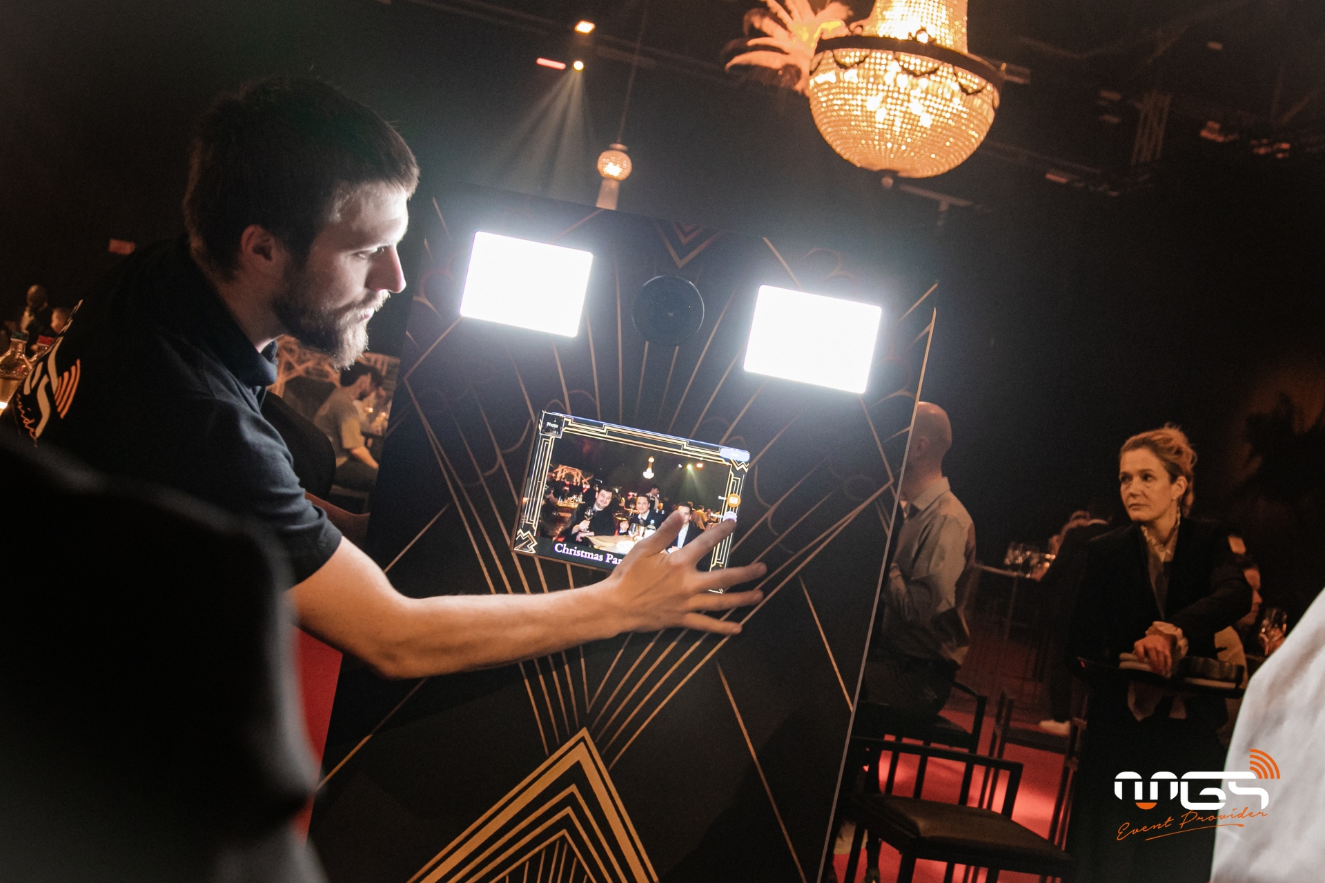 MGS a pu mettre à disposition son matériel et transformer Ciney Expo en deux espaces distincts : d’un côté, une ambiance festive dédiée à la soirée, et de l’autre, un espace consacré au repas. Notre équipe a pris en charge l’ambiance sonore, l’éclairage, la vidéo avec un écran LED de 50 m², deux animations photo, ainsi qu’une partie du mobilier et de la décoration, inspirées de l’univers de Gatsby et des années 1920.