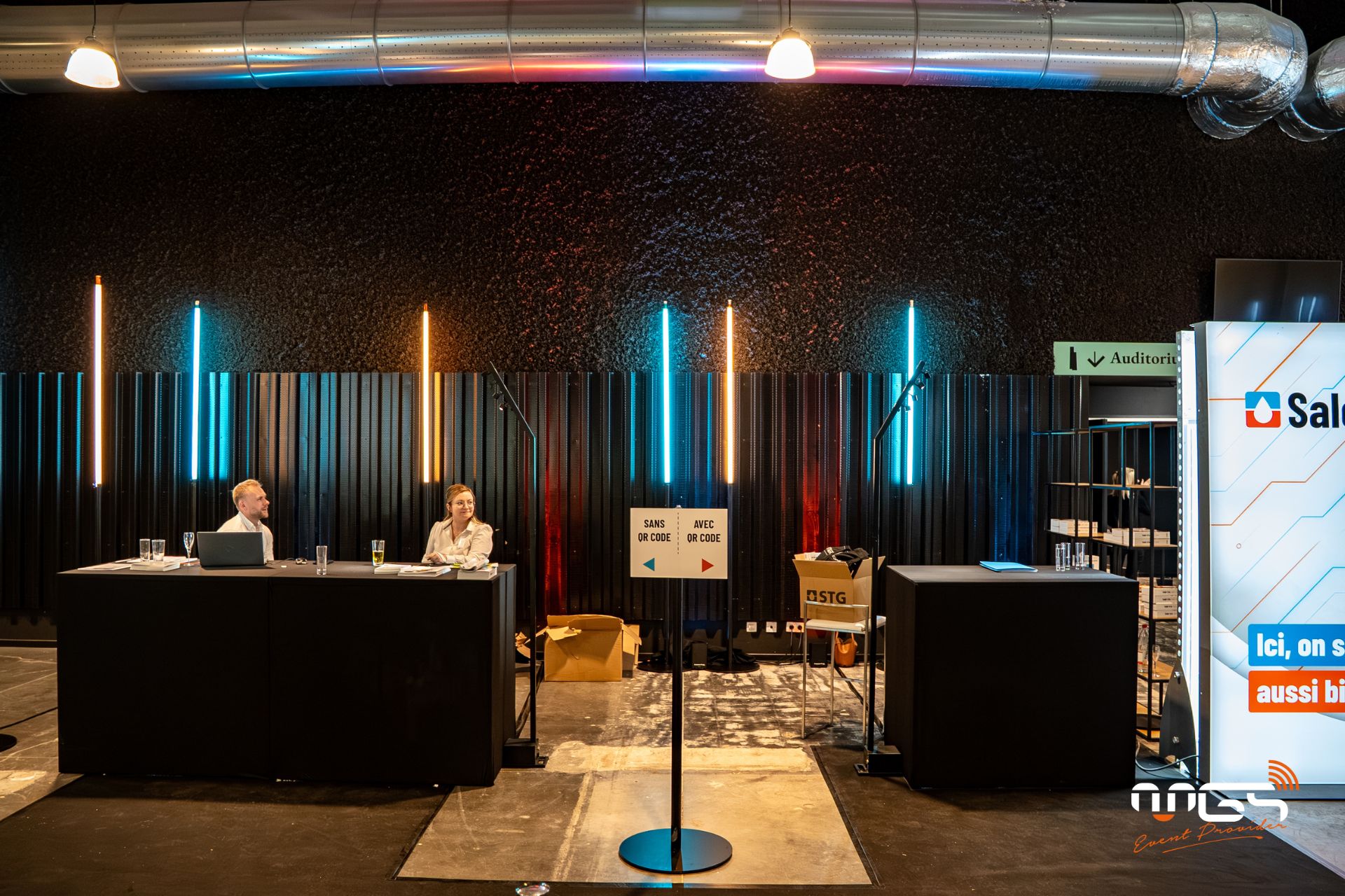Pour l’édition 2025 du salon professionnel STG, nous avons pris en charge l’aménagement complet de l’espace d’un des halls du Grand Palais de Charleroi. Notre équipe a conçu et installé 50 stands, géré le mobilier, la sonorisation, l’éclairage, ainsi que le photocall et la décoration, offrant ainsi un cadre professionnel et esthétique avec une touche de néons aux couleurs de STG.