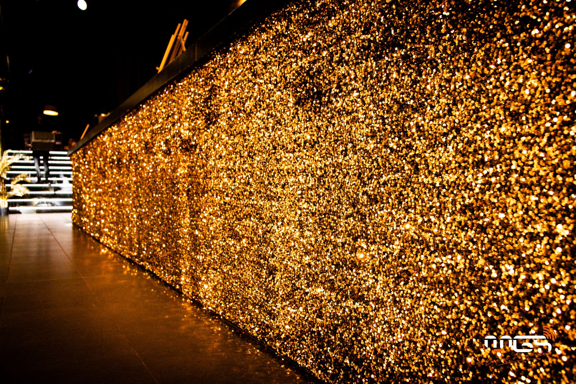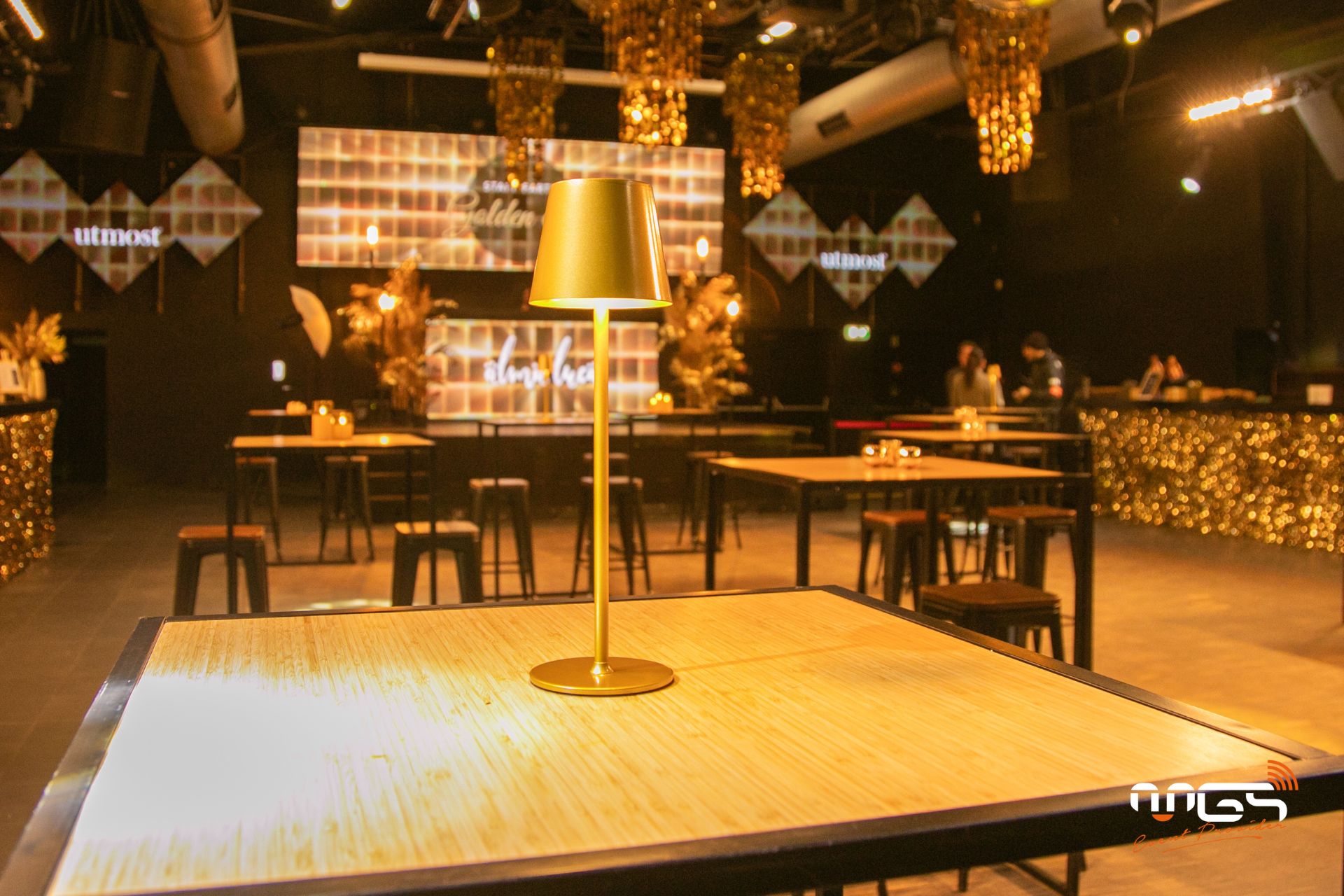 - (Décoration) : Lampe de table – Cloison vintage – Lampe sur pied – Lustre doré – Palmier doré – Bougies LED – Vase laiton