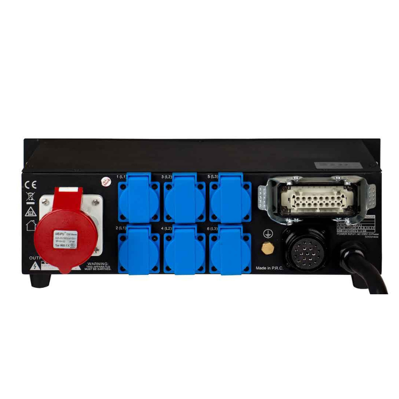 Le BRITEQ PD-32SH répartit l’alimentation vers six prises 220V, idéales pour alimenter directement des équipements lumière, audio ou vidéo. En complément, il intègre une sortie Harting, particulièrement utile pour connecter des structures ou des systèmes pré-câblés.