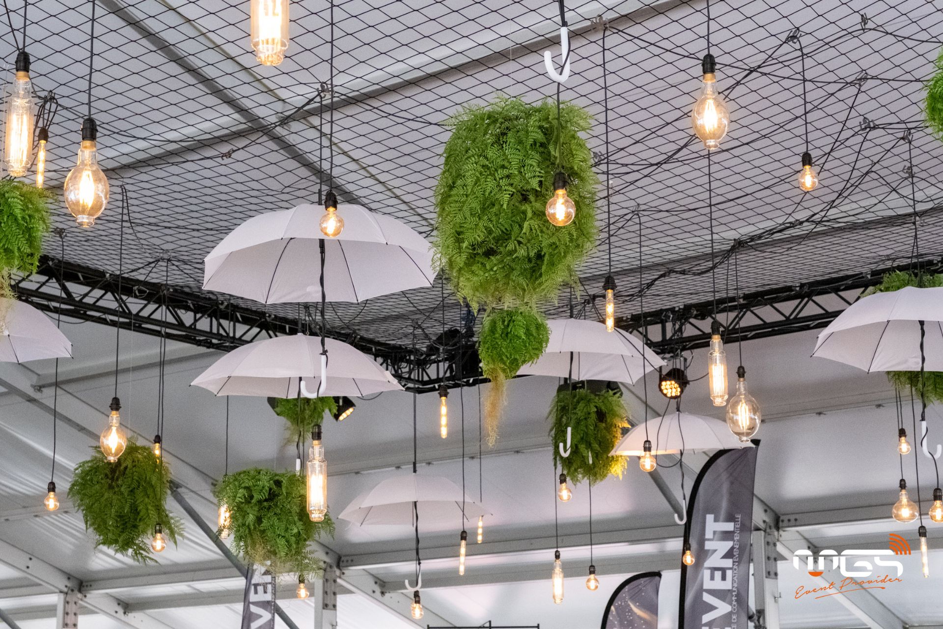 Cette décoration aérienne va au-delà d’un simple accessoire : elle capte le regard, invite à la déambulation et devient souvent un point focal pour les photos et les réseaux sociaux. Parfaits pour des thèmes colorés, estivaux ou artistiques, les parapluies suspendus accompagnés d’ampoules vintages et de verdures peuvent également être intégrés à d’autres éléments décoratifs (guirlandes, fleurs, lumières).