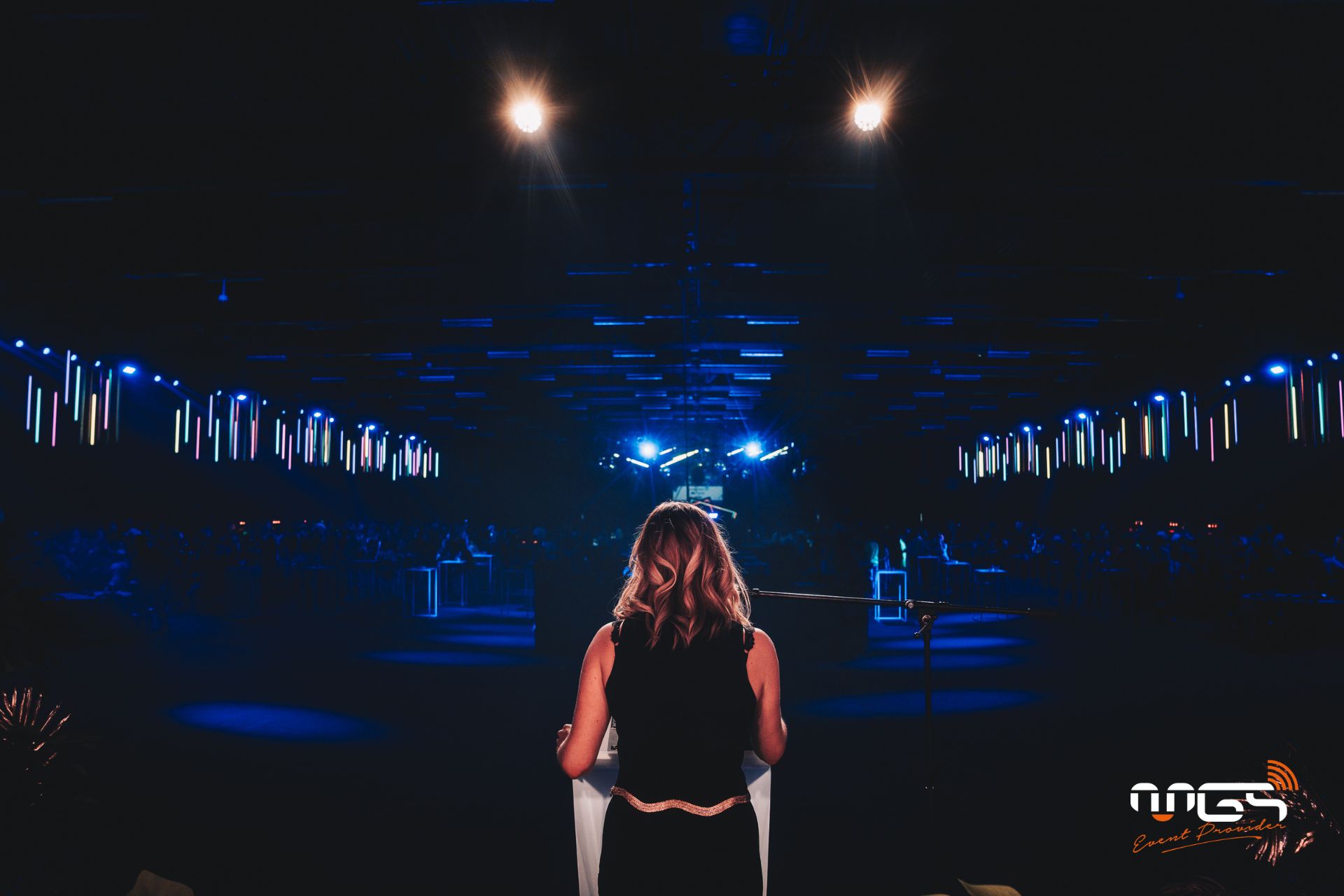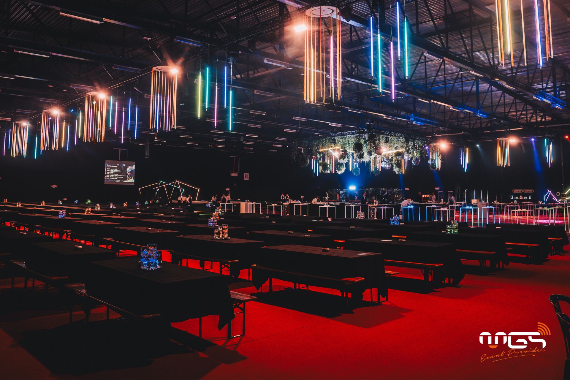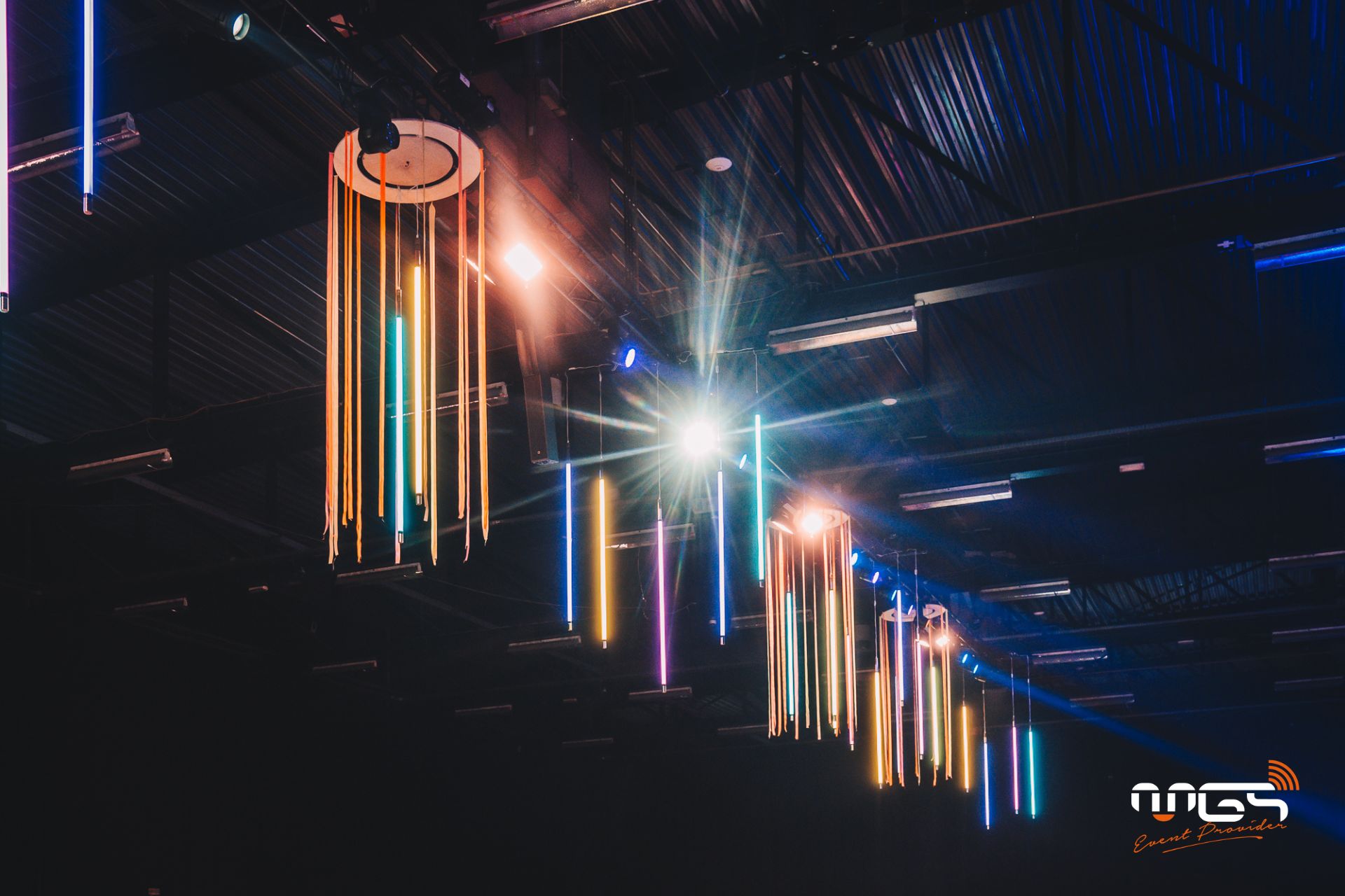 La couleur des suspensions néons est définie selon le choix du client, ce qui permet d’adapter parfaitement la décoration à l’identité visuelle de l’événement. De plus, plusieurs tailles de suspensions néons sont disponibles. Ainsi, il devient facile de jouer avec les volumes et de structurer l’espace en hauteur. Des rubans de couleurs intégrés complètent chaque suspension et renforcent l’impact visuel de l’installation.